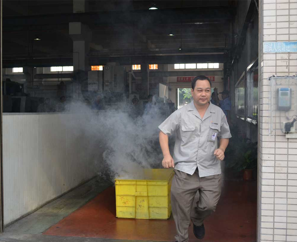9:30分,演練現場模擬順德塑料分公司和模具分公司的一層生產車間出現異常,導致廠區內濃煙滾滾。目前,事故原因還在排查之中。由于車間易燃物較多,一旦引發火災,將直接影響到二層紙箱和產品倉庫,事態非常危急緊迫!得知情況后,車間管理人員迅速啟動消防警報、組織車間義務消防員進行滅火自救,同時,向公司行政管理部保安室和區119指揮中心報警,并立即報告公司負責人和上級領導。